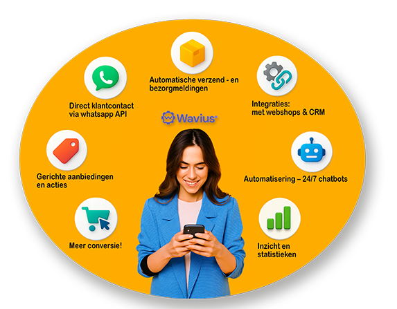 Zet WhatsApp in als service- én verkoopkanaal. Met Wavius stuur je notificaties, bied je support, verstuur je alerts, verifieer je gebruikers en voer je marketingacties — sneller, persoonlijker en zonder spam.