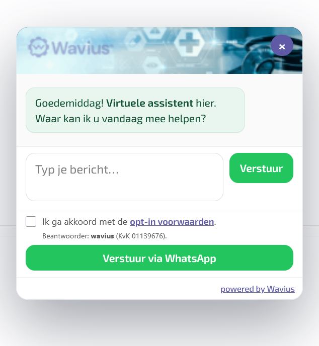 Wavius Messaging brengt twee werelden samen: bezoekers stellen vrij en uitgebreid vragen via de website-chat (OpenAI), en wanneer het persoonlijk moet, schakelt u direct door naar WhatsApp (Meta). Alles in uw eigen huisstijl, volledig SaaS embed — dus geen rommel of zware plugins op uw website.